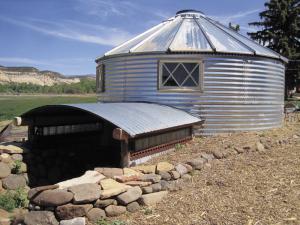 Travelers through Boulder, Utah often do a double take when they pass by what looks like a miniature grain bin at Scott and Brynn Brodie's Red House Farm. The shiny 18-ft. dia. corrugated steel bin with the trademark conical roof is only 12 ft. tall. It's decked out with sliding windows, a standard height white entrance door, and surrounded by nice landscaping. The casual observer doesn't know there's more than the eye can see: another 8 ft. of the bin is buried underground.