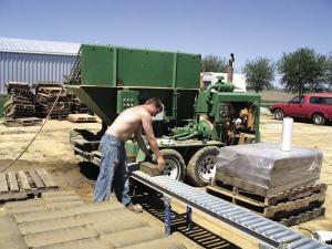 Johnson has the second largest EarthTek block maker, which cost him $60,000. It can be operated by a single person, but is most efficient with two or three people, he says. The machine can produce up to 360, 4-in. high by 14-in. long by 2 to 10-in. wide blocks per hour.