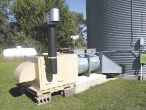 By putting a heat exchanger between the burner and the fan blowing the heat into the bin, Siebring uses drier air to begin with. The heat exchanger also prevents the water in the fuel from entering the bin.