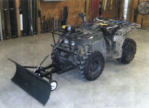 The snow blade is raised and lowered by an electric winch that’s operated by the ATV’s 12-volt battery. The winch hooks up directly to the back part of the blade. An angle iron frame supports the plow and pins onto the ATV’s frame.