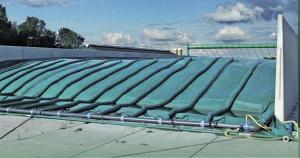 The heavy-duty plastic cover has propylene glycol lines fused to its top surface. As the cover is rolled onto the reel, the fluid is forced out of the lines and into a storage bladder. When the cover is rolled out, the fluid refills the lines.