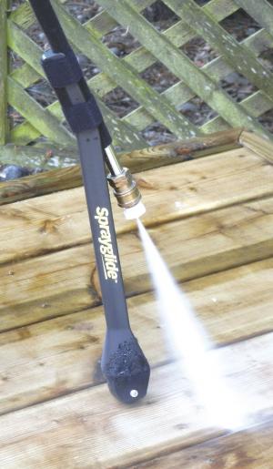 The Sprayglide® attachment (www.sprayglide.com) is a simple device that attaches to any pressure washer wand. A wheel glides along a deck to keep the pressure washer wand at a consistent distance to avoid gouging the wood.