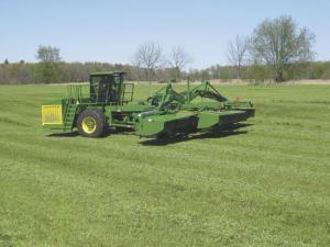 “We convinced him to try a self-propelled unit,” says Vogel. “We built a frame and used a 9L Deere diesel for the power unit. We reused Maust’s three Deere 994 rotary mower conditioner heads that were still nearly new.”