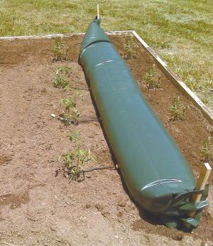 The 8-ft. Ooze Tube is held in place with stakes at each end and has a hole at the top to fill with a water hose. Line up the 4 drip lines at the base of 4 tomato plants. The tube holds enough water for about 10 days but, as plants grow, Downey recommends adding water more regularly - every 7 days, then every 3 or 4 days - to increase the amount of pressure and water delivered to the plants.