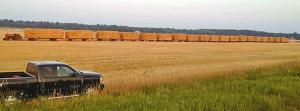 Timm’s 3,600-bale train was a variation on other lineups he had in previous years. “We started this with 15 and then 18 wagons a few years ago,” Timm says, “and last year we put all the straw from the field on 20 wagons and lined them up. It just seemed like a fun thing to do.”