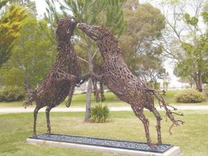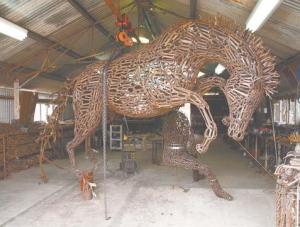 Piccoli’s most intricate sculpture is a sheep shearer working over a sheep with the fleece spread out in front of it. His biggest one is a bucking horse with rider.