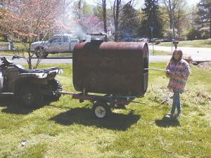 “It’s much safer than burning debris out in the open on the ground,” says John Jett, King George, Va., about the portable burn barrel he built out of an old 275-gal. fuel tank. It’s mounted on a small 2-wheeled trailer that he bought from Harbor Freight. He pulls it behind his 4-wheeler.
