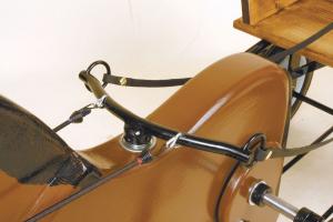 Chupp added elastic between the T-bar and the horse’s head. This ensures that once the turning rein is released, the wheel beneath the horse straightens out.