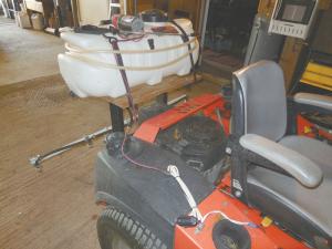 “Then I attached pieces of angle iron to the top of the channel iron so I could lay down a piece of plywood on which I mounted the tank. I ran wire from the on-demand spray pump to a switch and then to the battery, using alligator clips to connect to the battery.