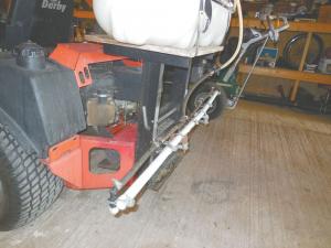 “It worked great as a spot sprayer but then I decided I also wanted a boom. I just added some L-shaped braces to the channel iron uprights, then used muffler clamps to affix a piece of 3/4 –in. pvc to the braces. I plumbed a ‘Y’ into the top of the tank to allow use of the spray wand and boom, which each have their own shut-off control. Then I used regular sprayer parts to mount nozzles on the pvc boom.”