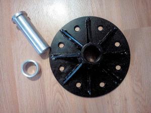 What Titera came up with was a puller plate drilled to match the bolt pattern on the hub. It has a big pin at the center. Once the wheel is removed, he slips the plate with the pin in it onto the bolts and tightens the lug nuts. The pressure of the pin against the axle pops the hub loose.