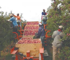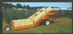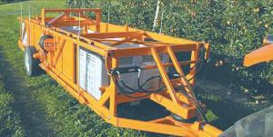 Fruit Picking Machine Perfected At Family Orchard CROPS Miscellaneous New York fruit producers Paul and Walter Wafler say that after nearly 12 years of work their self-propelled Huron Picking Platform is ready for market Powered by a small GX series Honda engine it uses just 2 1/2 gals of gas in 8 hrs and the Waflers say “it’s quiet and has plenty of torque even on sloping land ” Controls allow the platform to move automatically at a certain speed or it can also be operated manually The Picking Platform hauls up to 10 000 lbs and is designed for tree rows 11 to 13 ft apart Pickers stand on platforms to reach from 5 to 10 ft on the lower platform and 7 to 12 1/2 ft on the upper platform The ground level pickers reach up to 7 ft into the trees The brothers spent many hours tending trees and picking apples as kids They earned engineering degrees in college then eventually came back to the family business with the idea to design a machine to simplify their work They collaborated with Cornell University over the years to perfect the Picking Platform The design allows 8 workers to pick and fill 5 bins at a time Three of the 5 bins rest on a sloping platform and 2 more are just above ground level Four workers stand on platforms at two different levels on either side of the bins and pick fruit in sacks When their sack is full they turn about 180 degrees and place the fruit into the “V” at the bottom of their bin When the bins are full they’re replaced by 5 empty bins from a nearby trailer which takes only about 5 minutes “The apples have fewer bruises because the fruit doesn’t bounce around That means fewer apples have to be used for juice ” the Waflers say “We’ve been able to increase clean-picking productivity by 30 percent and about 100 percent for spot picking ” In addition to picking the machine can be used for other orchard maintenance tasks such as pruning drop wire installation wire stringing thinning branches tree training and pheromone application The Picking Platform has patents pending and sells for $62 500 The clamp-style trailer straddles 5 bins sitting on the ground extends its retractable forks under the box edges on each side and then lifts them off the ground An air suspension system on the trailer allows smooth bump-free transport that minimizes damage to the fruit The Bin Trailer weighs 2 500 lbs empty and handles 5 bins that are 42 to 45 in wide 46 to 48 in long and 27 to 32 in high Contact: FARM SHOW Followup Huron Fruit Systems 10748 Slaught Road Wolcott New York 14590 ph 585 615-5262; www huronfruitsystems com