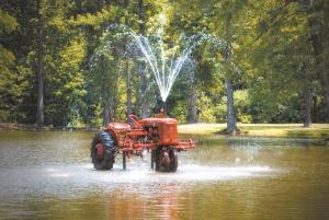 He had the Farmall B tractor installed in the 5-ft. deep pond about 10 years ago. Efurd drove four pipes deep in the mud and welded two “saddles” to hold the frame of the tractor just above the water. A 10-hp. pump sprays water through a 2-in. PVC pipe that comes up through the hood.