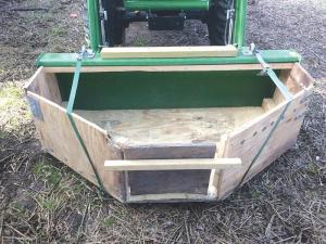Made of plywood, scrap 2 by 3’s, and angle iron brackets, it fits snuggly into the bucket of their 25 hp. Deere tractor and is easy to secure with a couple of straps.