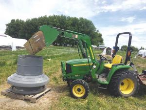 Filling bulk feeders out on pasture is no longer a tough job at Auntie Annie’s Fields farm. A former employee, John Riley, built a feed handler that fits into a loader bucket for the farm’s owners, Ian Rhoades and his wife, Elizabeth. It helps them quickly fill ten 800-lb. feed bins for their pasture-raised poultry and hog operation.