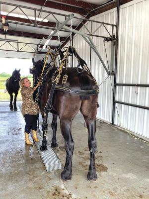 Harnessing a draft horse is not an easy job. Jennifer Watchous of Newton, Kansas, enjoys her draft horses and takes them to local parades. Harnessing always required help, which she wanted to get away from. Her harness maker came up with a unique solution called the “Harness Hire”.