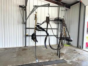 The harness maker and his local machinist designed an electric-operated crane that mounts on the wall of Watchous’s horse barn. Made from 2-in. sq. tubing, the crane extends about 15 ft. from the wall and supports a 4-ft. horizontal bar that has 3 hooks mounted it to support the harness. The crane is lowered to the floor, then a harness is connected. There are hooks for the hame strap, back pad, and the spider ring. Hooking up the harness to all 3 points balances the load.