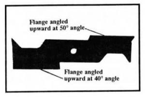 "The flanges are set at different angles, creating an uneven turbulence that's much more effective at lifting up grass and cleaning out the deck. It's like the difference between straight line winds in a storm and swirling tornado winds. The swirling, uneven winds do a lot more damage," ex-plains Hladik, noting that since he fitted his mowers with the new-style blade, he's never had to clean out under his mower decks even in moist grass. "I've mowed in the rain and grass didn't stick with this blade in place."