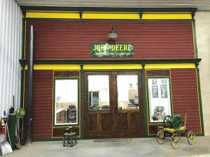 The storefront has wood painted in authentic John Deere colors, and cornices holding a decorative shelf across the front that the Sperrys made in their woodshop. Custom-made doors out of alder wood create a 10-ft. opening like the John Deere store doors were built, so that equipment or tractors could be taken inside for display.