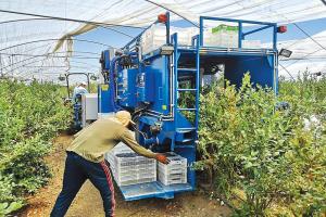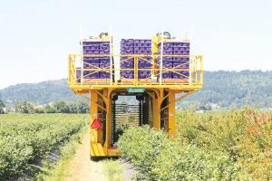 The Harvy 500, manufactured by FineField of the Netherlands, utilizes bendable brushes and workers who shake the blueberry bushes to drop the ripe fruit into a conveyor system that includes air to blow out debris before the berries fall gently into lugs and crates. Plans were to test them in British Columbia this year. www.finefield.nl