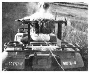 This wire unrolling bracket, which weighs only 5 lbs., fits on the carrier bracket on our ATV's. It hooks to the rear bar with an angle iron bracket - requires no bolting. Works great for unrolling new or even old rerolled rolls of wire. It's handy for putting up a new fence, making repairs on fences, or for setting up temporary cattle fence around corn fields. (Marvin Singry, Rt. 1, Box 10-A, Hazel, S.Dak. 57242)