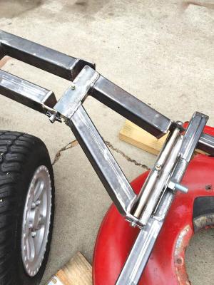 Bond built a frame around the tractor out of 2-in. by 2-in. steel tubing. He had previously added a foam bumper to the front of the garden tractor. It had mounted to 1 1/2-in. square tubing welded to each side of the tractor frame. He removed the bumper and slid the frame into the receiver hitches and pinned it in place.
