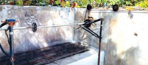 “I dug through a scrap pile of old metal on the island,” Cronk says, “and came up with parts of bicycle frames, chains, four or five sprockets, and some old brackets. I used an old boat rail for the skewer. A bike foot crank mated to a piece of pipe served as the main shaft. For sanitary purposes, I slipped a piece of stainless steel over the pipe. That whole mechanism was anchored to the firebox with metal brackets.”