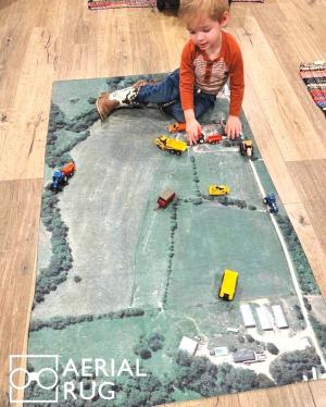 David got the idea for farm scenes on rugs while watching her young son play with his toy tractors and thinking how much fun it would be if he could roll his tractors over an image of their farm.