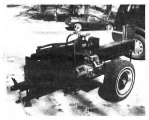 "I tried to incorporate the best features from other splitters," says Clow, who runs a machine shop. "I built it for a customer who got tired of using splitters that weren't built heavy enough. The beams would bend or the wedges would break. This splitter is built heavy but is lightweight and well balanced which makes it easy to hook up to a vehicle. There's a lift handle on the hitch end and a slide tube jack on each end. The engine and cylinder are mounted on the hitch end of the splitter, with the wedge on the other end, so you can split a pile of wood and then simply drive away from it instead of having to move the pile.