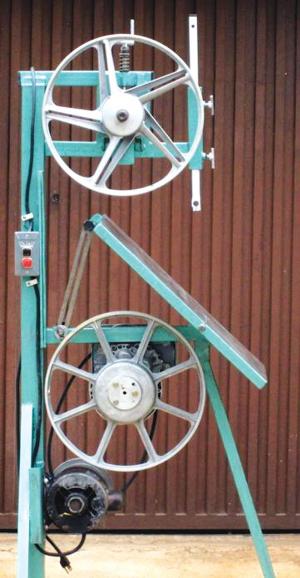 Foale says the 1-in. wide by 16-in. dia. wheels were perfect to run the 1/2-in. blade on his shop-built bandsaw. One was a front wheel with bearings and a brake, and the other was a rear wheel without bearings, just right for a single-sided mounting. Foale built the frame and tilting table for the saw from his inventory metal and mounted an electric motor to drive the blade.