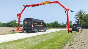 The 25-ft. upper horizontal pipe reaches across most standard 24-ft. roadways. In the raised position, a turnbuckle ensures the unit is level even when the wheels are on a slope or partly in a ditch. The bridge is 20 ft. tall on flat ground to accommodate 16-ft. clearance regulations. It maintains the minimum clearance even up to 4 ft. into a ditch.