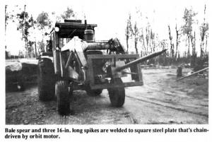Rawluk used 4-in. sq. steel tubing to build a rectangular frame that bolts onto the loader in place of his grapple fork. A 3-in. dia. bale spear made from a solid steel shaft and three 16-in. long spikes are welded to a square steel plate that's chain-driven by an orbit motor.