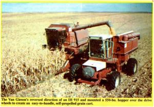 Self-Propelled Grain Carts Built From IH Combines COMBINES Conversions 19-2-1 "Last fall we used two of these rigs to haul approximately 1,700 bu. of corn per hour away from an International 1688 combine and the combine rarely ever got ahead of us, even though we sometimes had to travel a mile to the bin and back," says Harley Van Gieson who built the two big, self-propelled grain carts out of International combines.