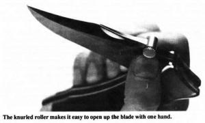 The knurled roller tightens down in place with a set screw. Can be mounted anywhere along the blade. Can be unlocked and re-mounted on another knife. Precisioned machined out of stainless. Sells for $9.95.