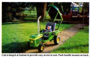 The stroller was designed and built by Tim Vanden Hoek and his father, Vernon, last summer for Tim's 6-month-old daughter Kelsi. It's 54 in. long, 29 in. wide at the back, and 44 in. high. The cab is hinged at the bottom and tips backward to provide easy access to the seat, which is secured to the carpeted floor. Head lights and tail lights are built into the fenders. An automobile tailpipe was used for the exhaust stack, and the tires were taken from a riding lawn mower. The oscillating front wheels float over uneven terrain just like a real tractor. There's even a car radio (powered by a moped battery) built into the dash. A push handle mounts on back.