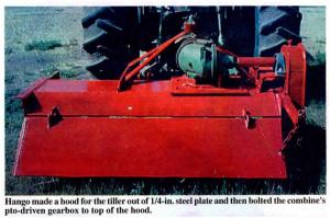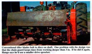 says Hango, who pulls the roto-tiller behind his 35 hp Deere 1040 tractor. "I bought all of the combine parts at a sale for $20. The rest of the money was for new roto-tiller blades. A hinged "door" on the back side keeps dirt from flying out the back side of the machine and helps to level the ground. The rig is offset to one side so I can work the ground close to trees without having tree branches in the way. Each blade is mounted slightly ahead of the one next to it, forming a slight spiral pattern that keeps all the blades from hitting the ground at the same time so they don't bounce up and down too much.