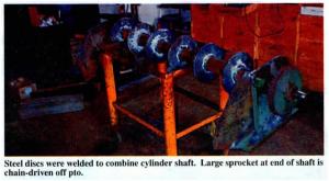 He removed the 40-in. long threshing cylinder and stripped it down to the shaft, keeping the bearings and part of the steel frame on each end of the cylinder shaft. He cut the shaft in half and welded each end into a 3 1/2-in. dia., 5-ft. long, 1/2-in. wall steel pipe. He cut round discs out of 1/4-in. steel plate and welded pairs of them together, then had a machine shop punch holes in them. He then welded the discs onto the pipe and bolted commercial roto-tiller blades onto them.