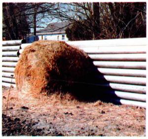 He drives a steel post on each side of the pipe and piles it up about 6 ft. high on the north side of his feedlot. Bales of hay laid next to the pipe are hand fed to stock. An electric fence wire placed 8 to loft. from the pipe keeps animals away from the pipe and bales.