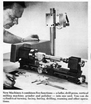 The multi-purpose machine is capable of machining any small part made of metal, plastic, or wood, according to Heineman. It combines five functions - a lathe, drill press, vertical milling machine, grinder and polisher - into one compact unit. "Even if you've never turned a single part, Machinex 5 will let you create finished items in steel, brass or aluminum on your very first try. You can do cylindrical turning, facing, boring, drilling, reaming and lathe operations."