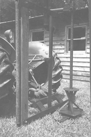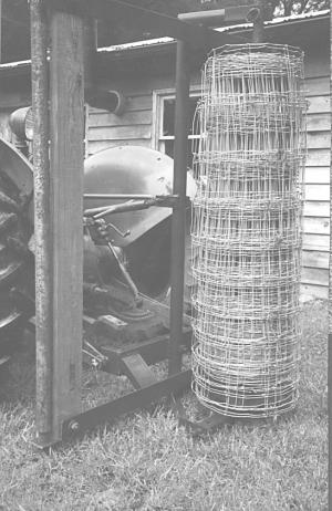 "The rig mounts between the lift arms on the tractor. I used an old drawbar for the pivot point beneath the wire roll. It can be dropped down to the ground to make it easy to slip the roll on. The rest of it was made out of scrap metal. The only parts I bought were 3-pt. hitch pins.