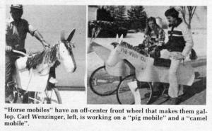 "It's been a real hit in parades," says Wenzinger. "A lot of people wanted one, so I bought 50 old bikes to convert into horse-mobiles. This winter, I'm working on a patent and organizing a company to build and market them."