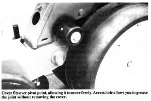Quigley designed covers that fit over each pivot point, allowing it to move freely and with an access hole so you can still grease the joint without removing the cover, which attaches using the existing pivot arm bolt and a washer. "Now, instead of greasing several times a day, I can go two or three days between greasings with no problem."