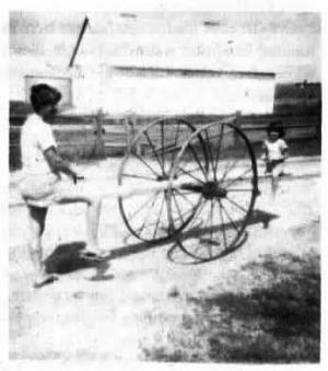 Old wheeled dump rakes make nifty rolling teeter totters. I found an old rake axle and wheels in a neighbor's junk pile. All that was left was the 10-ft. wide angle iron axle frame with the wheels mounted at either end. I cut out the center and joined the two short pieces together with the wheels attached. The wheels still turn and the shortened-up angle iron frame pivots freely. I simply bolted a 2 by 10-in. by 12-ft. long board to the angle iron thus making a rolling teeter totter that can be used standing still but can be rolled anywhere around the farmyard. I welded together T-bar handles for either end. (Rick Mabeus, Rt. 2, Box 62, Winfield, Iowa 52659)