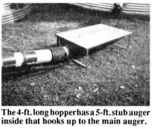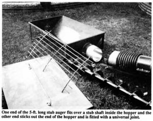 Here's how the hopper works: Stuckey mounted a fixed stub shaft inside one end of the hopper. One end of the 5-ft. long stub auger fits over the stub shaft - the other end of the auger sticks out the end of the hopper and is fitted with a universal joint.