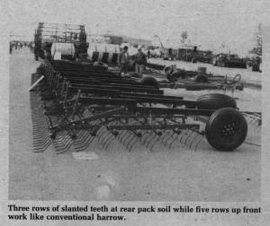 The new packer harrow can be used for either pre-seeding seedbed preparation, or for post-seeding packing to draw moisture up to seed level. In addition, the packer units can be locked up into the up, non-operating position, transforming the machine into a conventional harrow. The heavy trash-clearing 14-in. packer teeth are staggered every 2 1/3 in. to provide uniform packing over the entire seed bed.