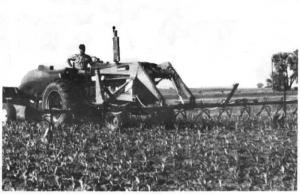 The spray boom is built in three sections with a 6-row section in the middle. The boom simply mounts in place of the bucket with four pins. The loader's bucket-tilt cylinders change the boom pitch. Adjust-able 4.00 by 12 castor dolly wheels sup-port the boom ends.
