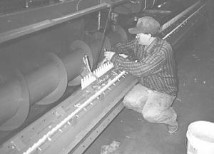 Kinnie's stripper header is hydraulically driven by a 40 gpm pump with a 50-gal. oil reservoir mounted on the head. It powers a 45 hp orbit motor that drives a 12-in. dia. stripper rotor he built out of 1/ 4-in. thick pipe. The rotor is fitted with keyhole-shaped stripper fingers he made out of 1/2-in. thick UHMW plastic.