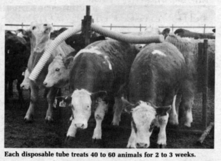 Dust (1 percent Coral) comes in disposable tubes which you throw away when empty. The tubes are 4 1/2 in. in dia. and 44 in. long. One tube treats approximately 40 to 60 animals for two to three weeks, says Roger Swihart, distributor.