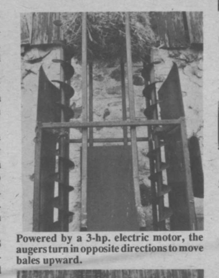 The augers, powered by a ground-level 3 hp electric motor, rotate in opposite directions, grabbing the edges of each-bale and moving it to the top of the cage. There, a bar deflects it into the opening at the top of the barn. You can move bales farther into the barn with a "skeleton" elevator, or by hand.