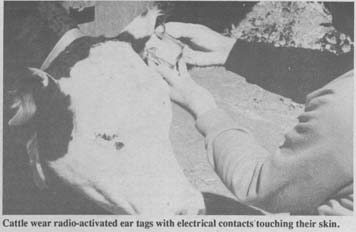 The system consists of a transmitter that installs in the middle of an area where you don't want the animals to graze. The transmitter sends out a signal over a 360 degree area. Cattle wear radio-activated ear tags with electrical contacts touching their skin. If an animal wanders into the excluded area, the ear tag picks up the transmitter's signal which buzzes a warning sound. If the animal continues into the area, he gets a mild electric shock that continues repeatedly until the animal leaves the area.